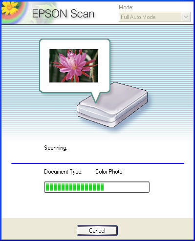 The following window appears with a progress bar to indicate the scanning progress. You can see the type of document being scanned. When scanning multiple photos, you can also see the number of scanned images.