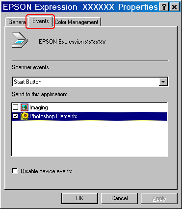 If you need to disable the Scanner events, select the Disable device events check box in the scanner's Properties dialog box.