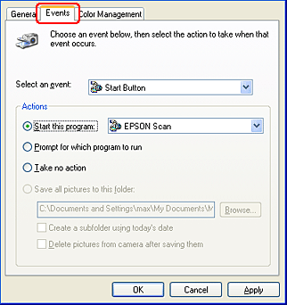 If you need to disable the Scanner events, select Take no action in the scanner's Properties dialog box.