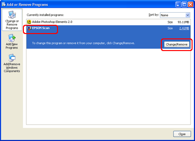 Select EPSON Scan from the list, then click Change/Remove (for Windows XP or 2000 users) or Add/Remove (for Windows Me or 98 SE users).