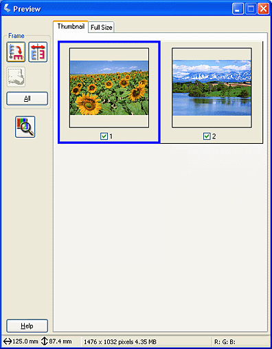 The Thumbnail Preview method allows you to preview multiple images in a thumbnail layout. EPSON Scan automatically locates the target images and applies the Auto Exposure feature to each image. You can modify each thumbnail image and make additional image adjustments.