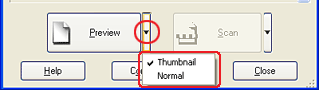 Clicking Preview in the Home Mode or Professional Mode starts prescanning and previews the image. Depending on the scanning mode and the Document Type settings, a small arrow appears to the right of the Preview button allowing you to select a preview method. Click the arrow and select Thumbnail or Normal to change the preview method.