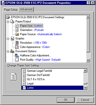 Make sure that your printer is selected and then click Printer, Setup, Properties, or Options. (You may need to click a combination of these buttons.) The Document Properties window appears, and you see the Page Setup and Advanced menus. These menus contain the printer driver settings.