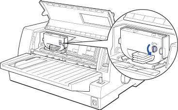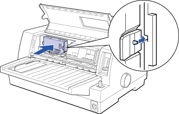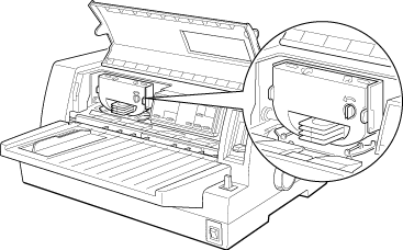 | Hold the ribbon cartridge by its handle and push it firmly down into position; then press on both ends of the cartridge to make sure the plastic hooks fit into the slots. |