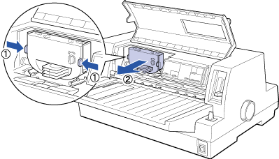 | Squeeze the tabs on each side of the cartridge, and pull the cartridge out of the printer. Properly dispose the used ribbon and cartridge. |