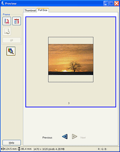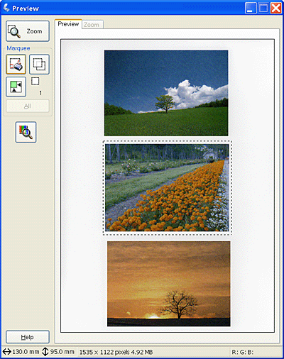 The Normal Preview method allows you to see the entire previewed image and the effects of settings you made, and to make additional image adjustments. You can also use marquees to scan selected portions of an image. For details on marquees, see Using marquees.
