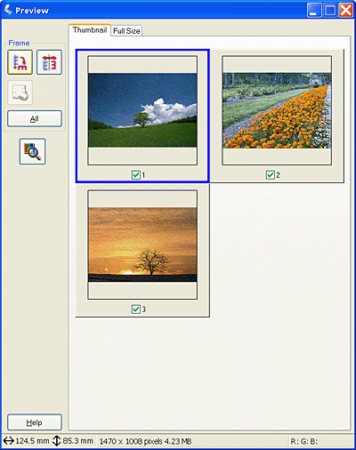 The Thumbnail Preview method allows you to preview multiple images in a thumbnail layout. EPSON Scan automatically locates the target images and applies the Auto Exposure feature to each image. You can modify each thumbnail image and make additional image adjustments. You can also use marquees to scan selected portions of an image. For details on marquees, see Using marquees.