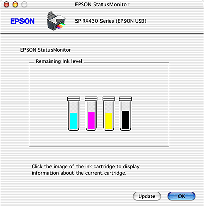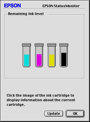 The graphic displays the amount of ink that was remaining when EPSON StatusMonitor was first opened. To update the ink-level information, click Update.