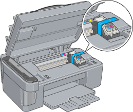 | Open the scanner unit and make sure that the print head is in the home position on the right. Secure the ink cartridges to this product with a tape, and then close the scanner unit. |