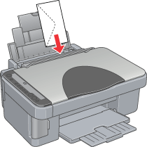 | Load the envelopes with the short edge first and the flap side to the left against the right edge guide, and slide them into the sheet feeder. |