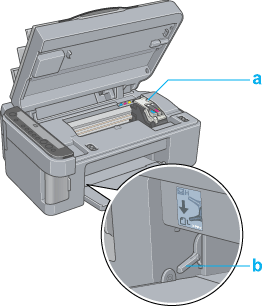 b. Adjust lever: Adjusts the distance between the print head and the paper to prevent smearing. Adjust the position of the lever should ink appear to smear across your document when printing on thick paper or envelopes.