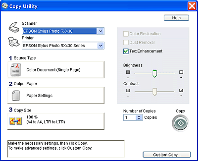 Use this application to turn your scanner into a digital copy machine, yet its functions are far more powerful and flexible than conventional copy machines. Using this application, you can scan and then print images as photos. You can copy in various sizes, or place several photos on the same page. Before you print an image, you can see the effects of image adjustments using the Preview window. When you launch this application, the following screen appears.