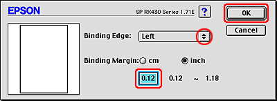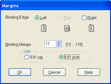Specify the width of the binding margin in the text box. You can enter any width from 0.12 inch to 1.18 inch or from 0.3 cm to 3.0 cm.