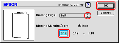 Choose cm or inch as the Unit setting. Specify the width of the binding margin. You can enter any width from 3 mm to 30 mm, or from 0.12 inches to 1.18 inches. The specified margin width will be used on both sides of the fold. For example, if a 10-mm margin is specified, a 20-mm margin will be inserted (a margin of 10 mm will be placed on each side of the fold).