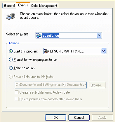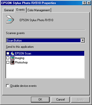 If you need to disable the Scanner events, select the Disable device events check box in the scanner's Properties dialog box.